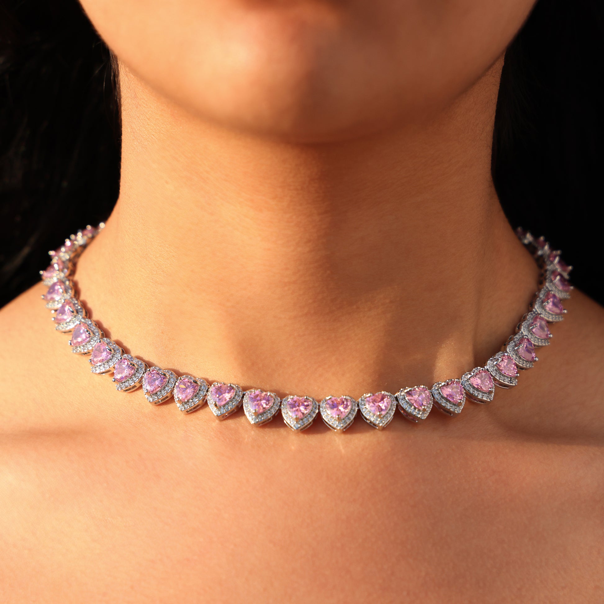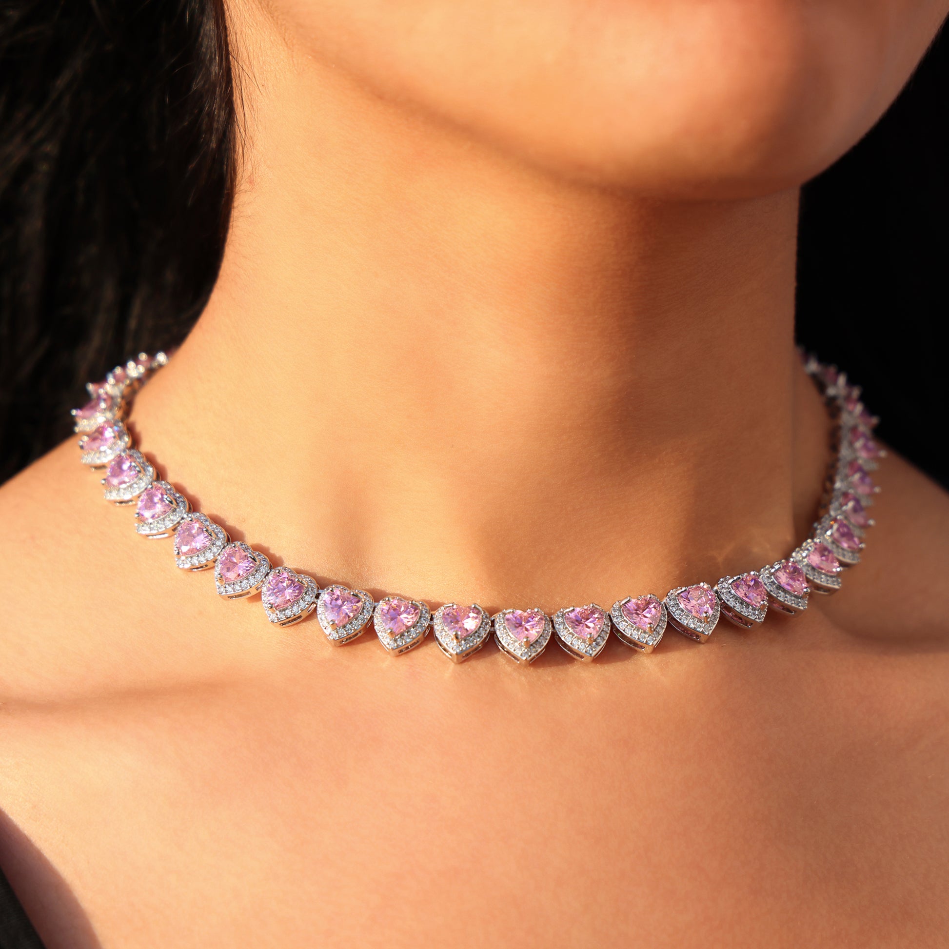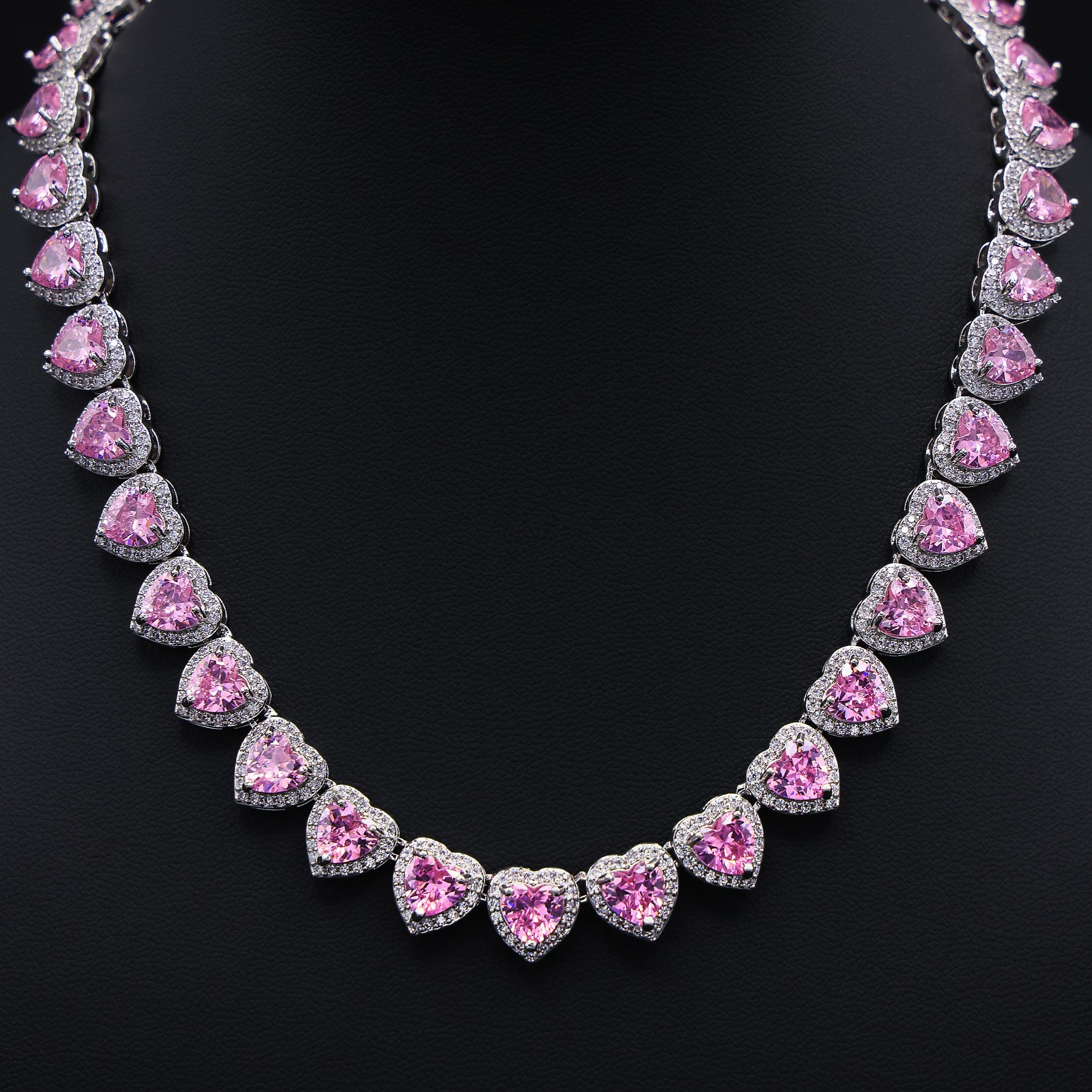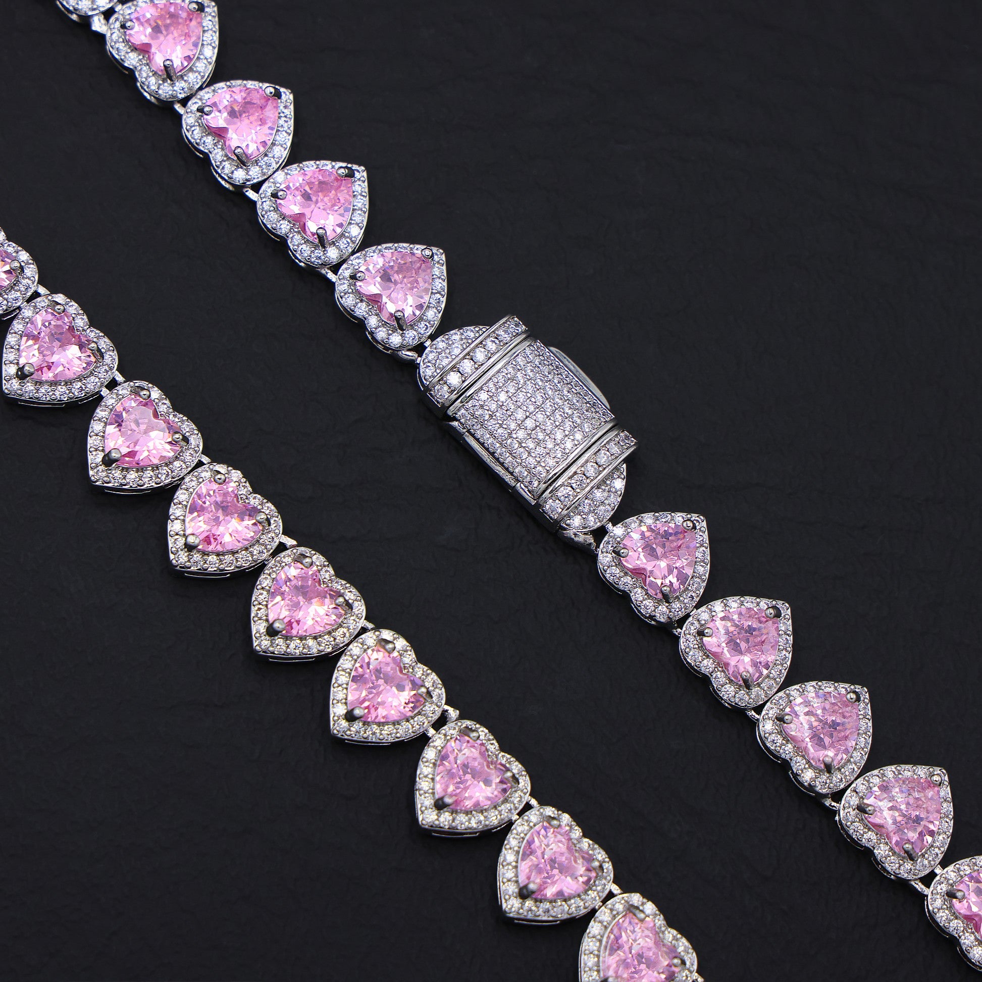 Pink Heart Diamond Clustered Tennis Necklace - White Gold