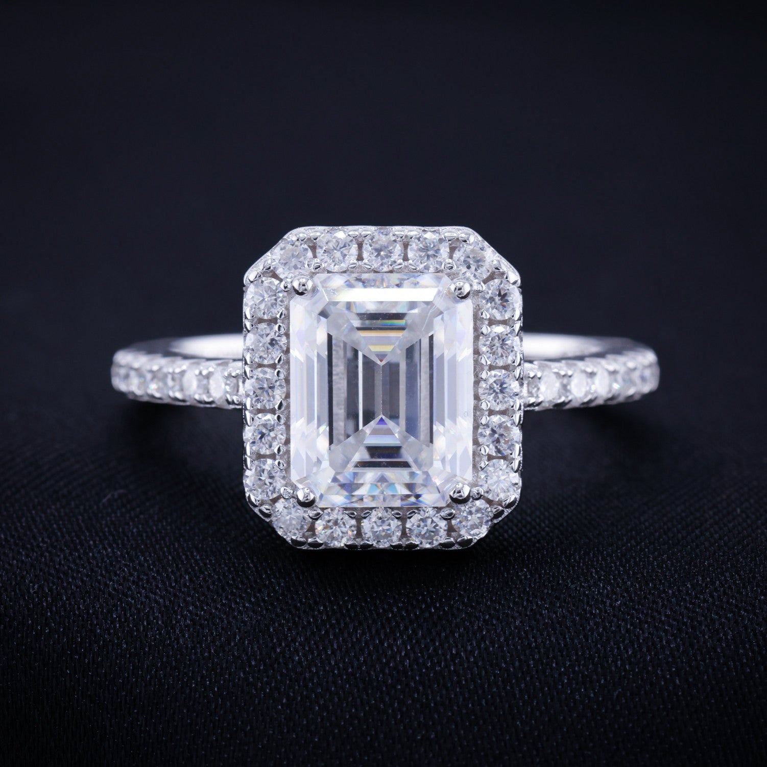 3ct Moissanite Emerald Cut Halo Ring - 925 Silver