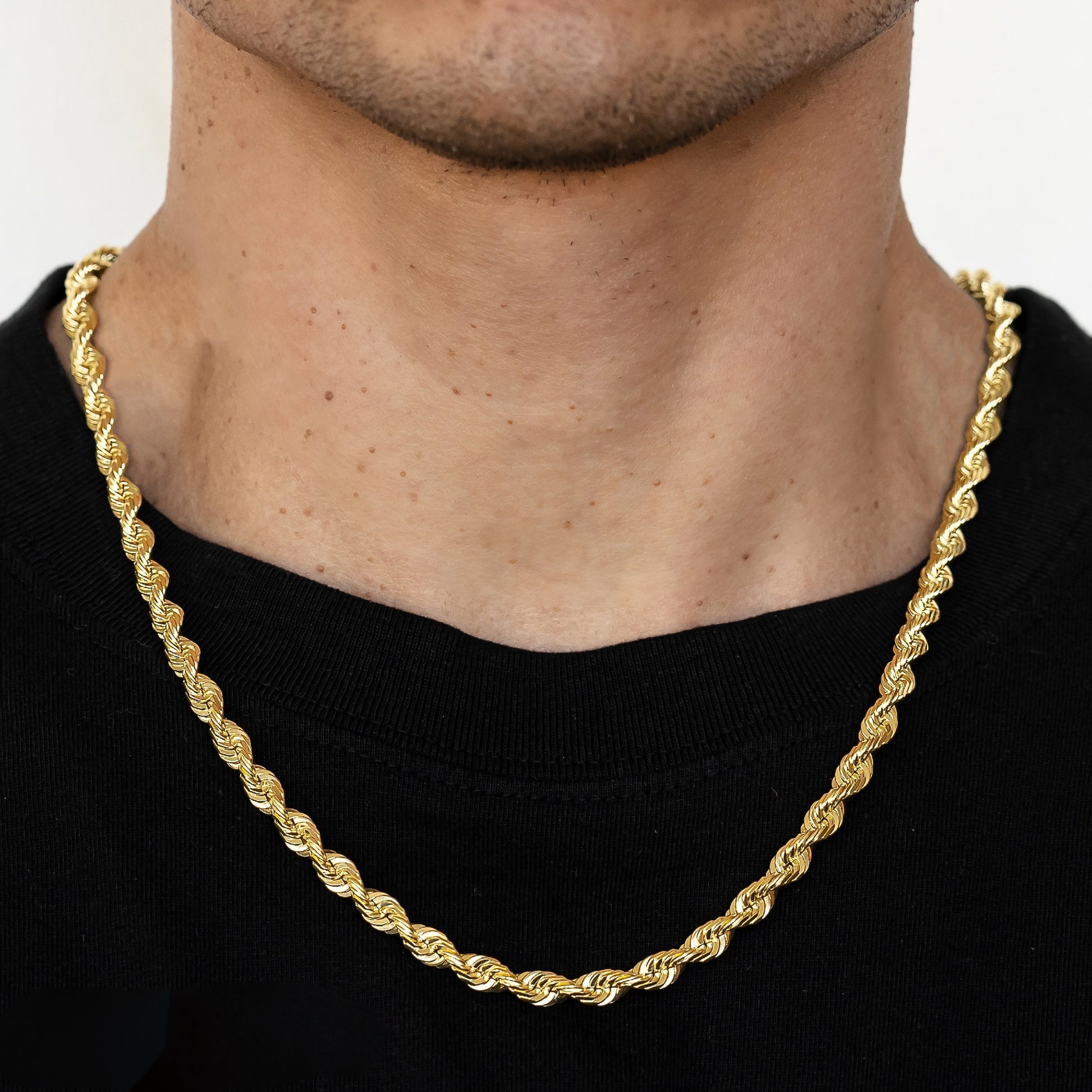 Elevate your style with this luxurious 6mm solid diamond cut rope chain, expertly crafted from 14k gold for a bold yet refined look. Its diamond-cut design enhances the brilliance and shine, catching light from every angle and making it the perfect statement piece. Whether you’re dressing up for a special occasion or adding a touch of elegance to your everyday attire, this rope chain is designed to turn heads.