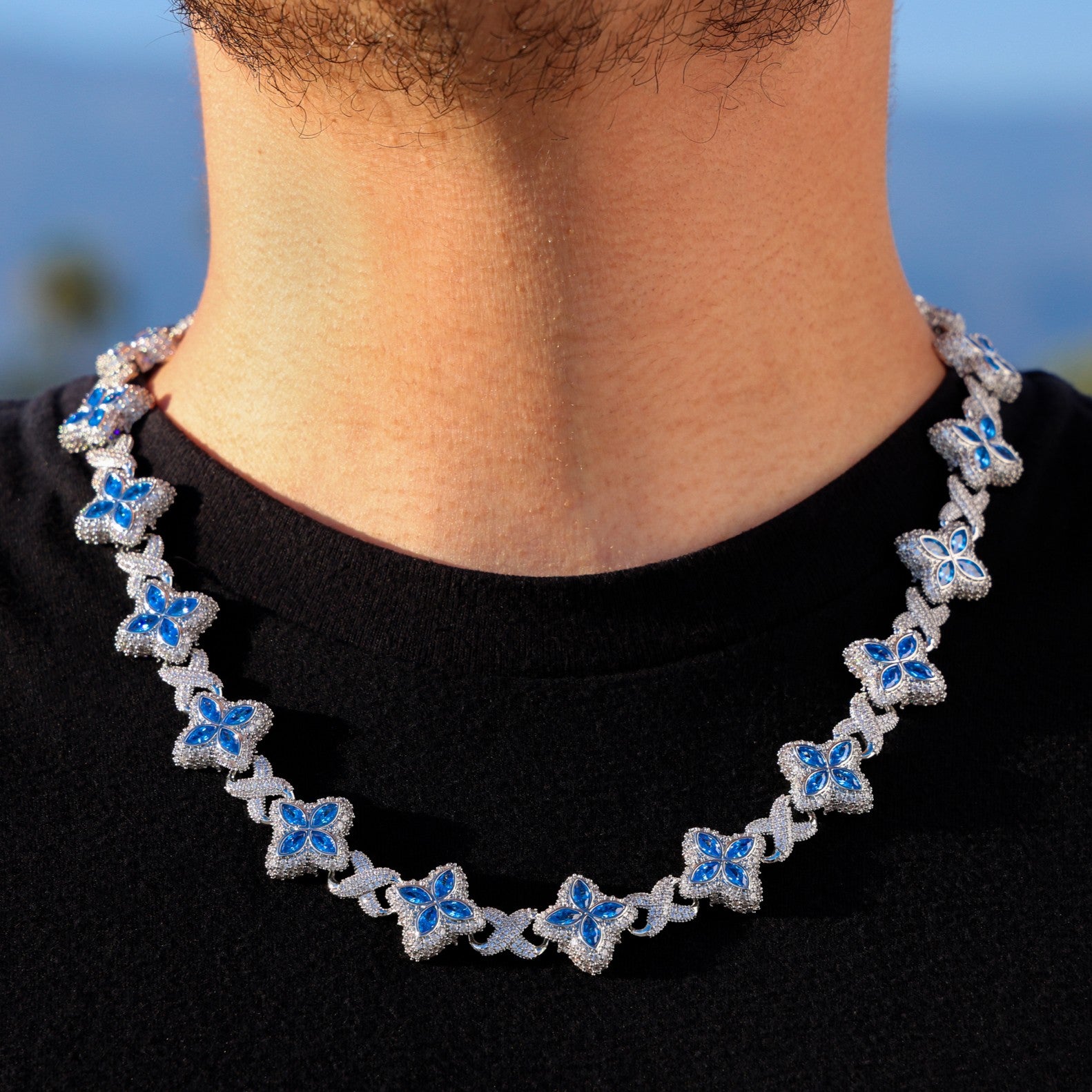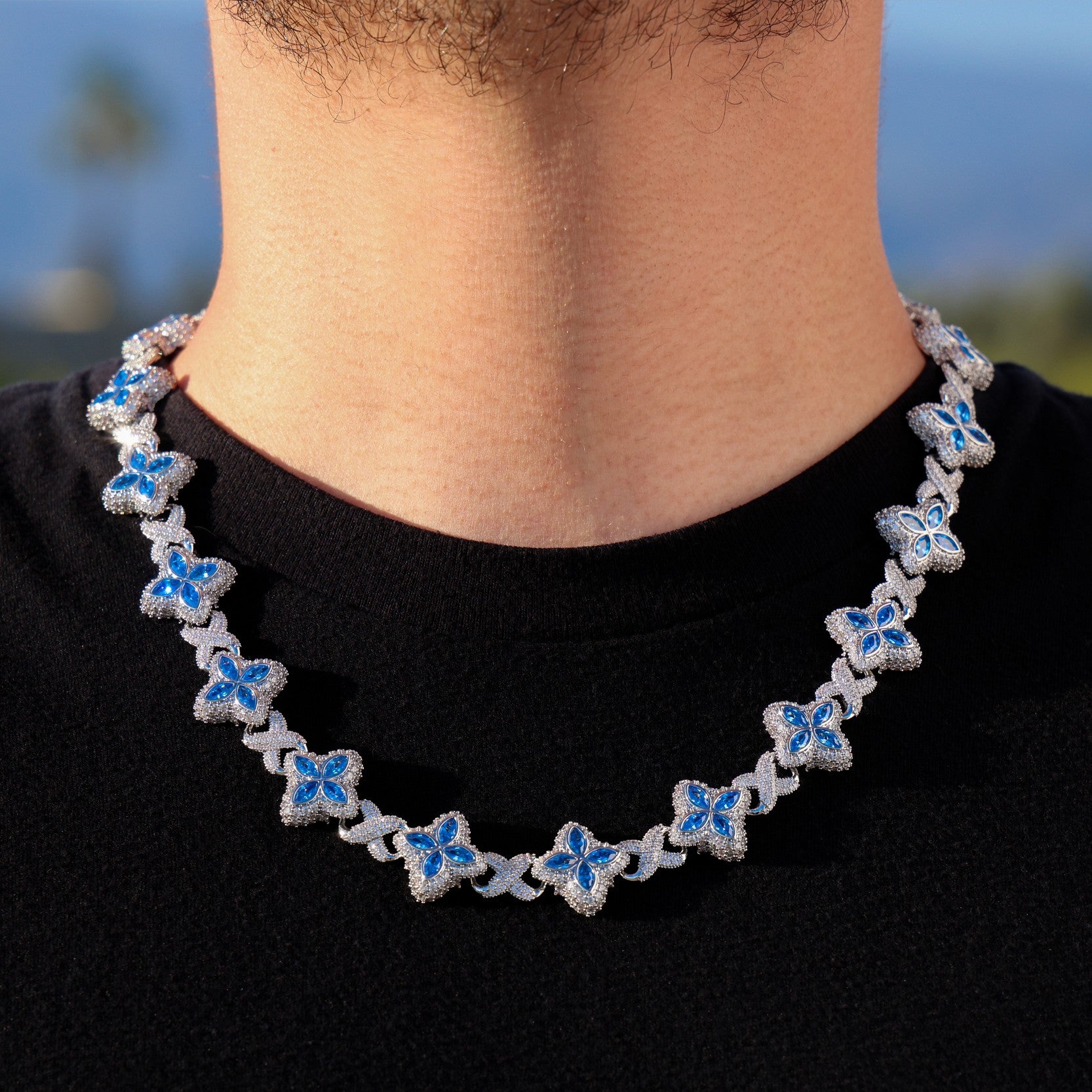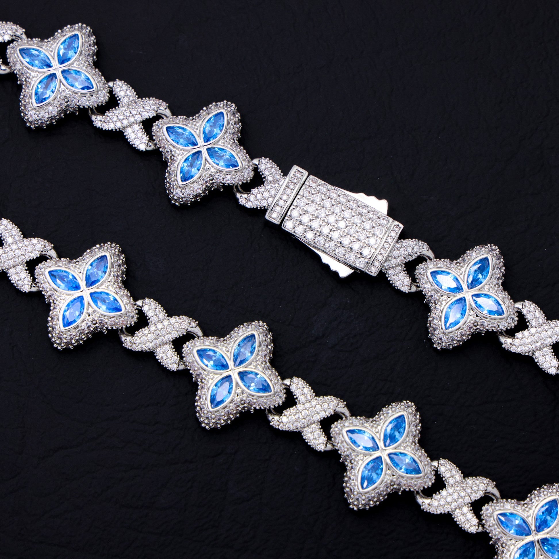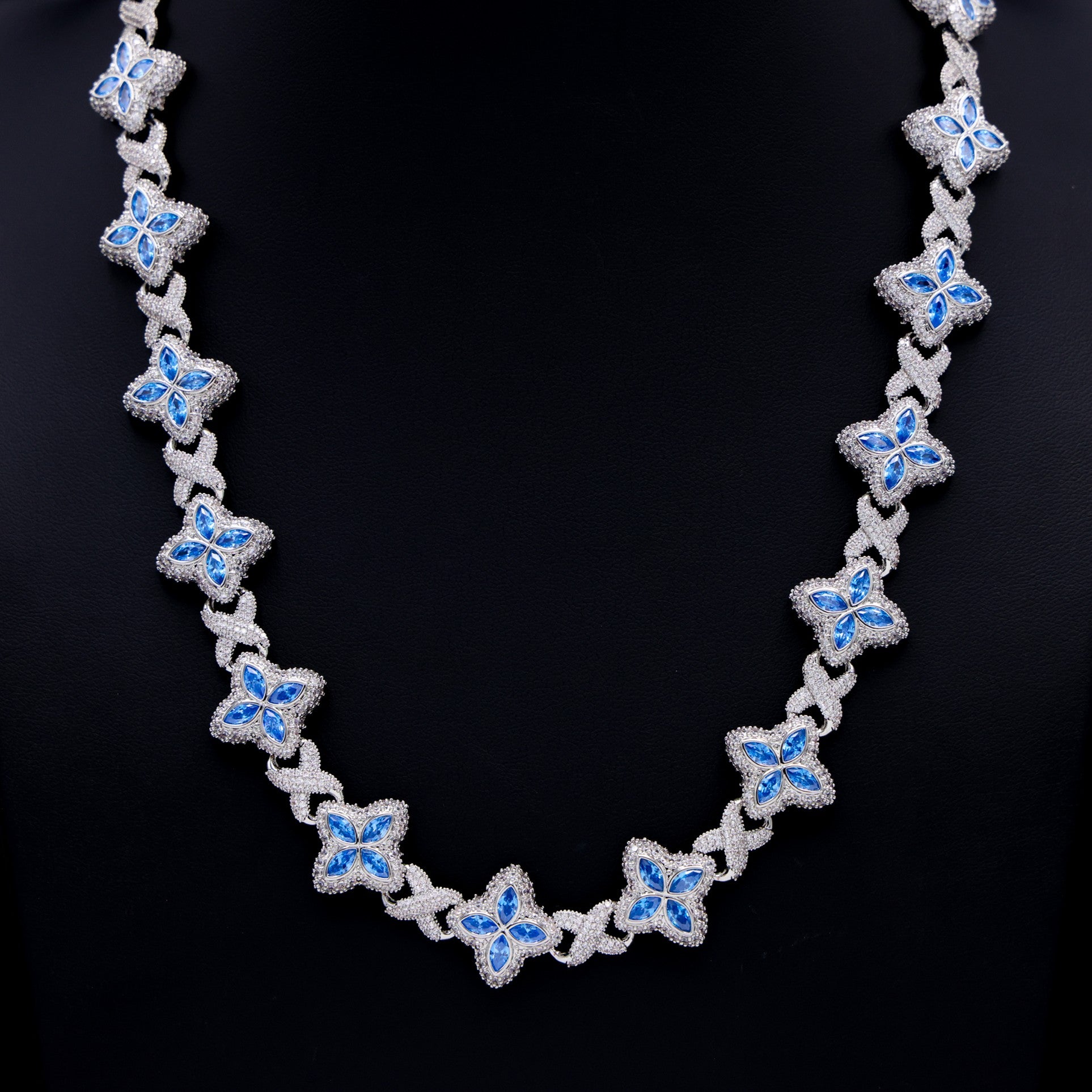 Iced Aqua Blue Clover Link Chain - White Gold