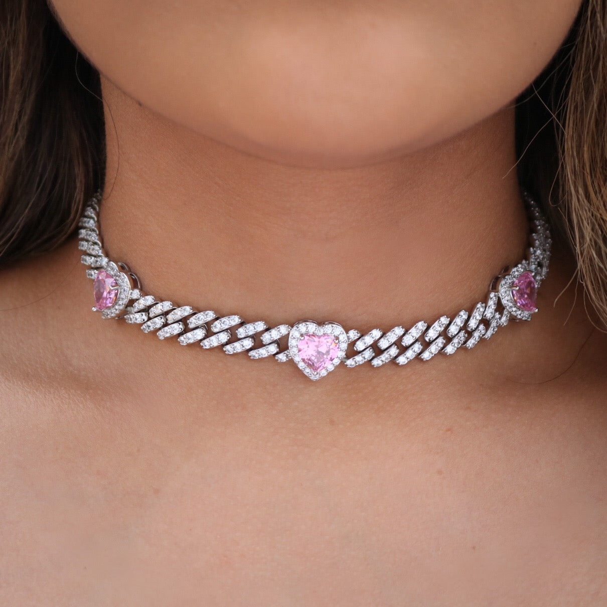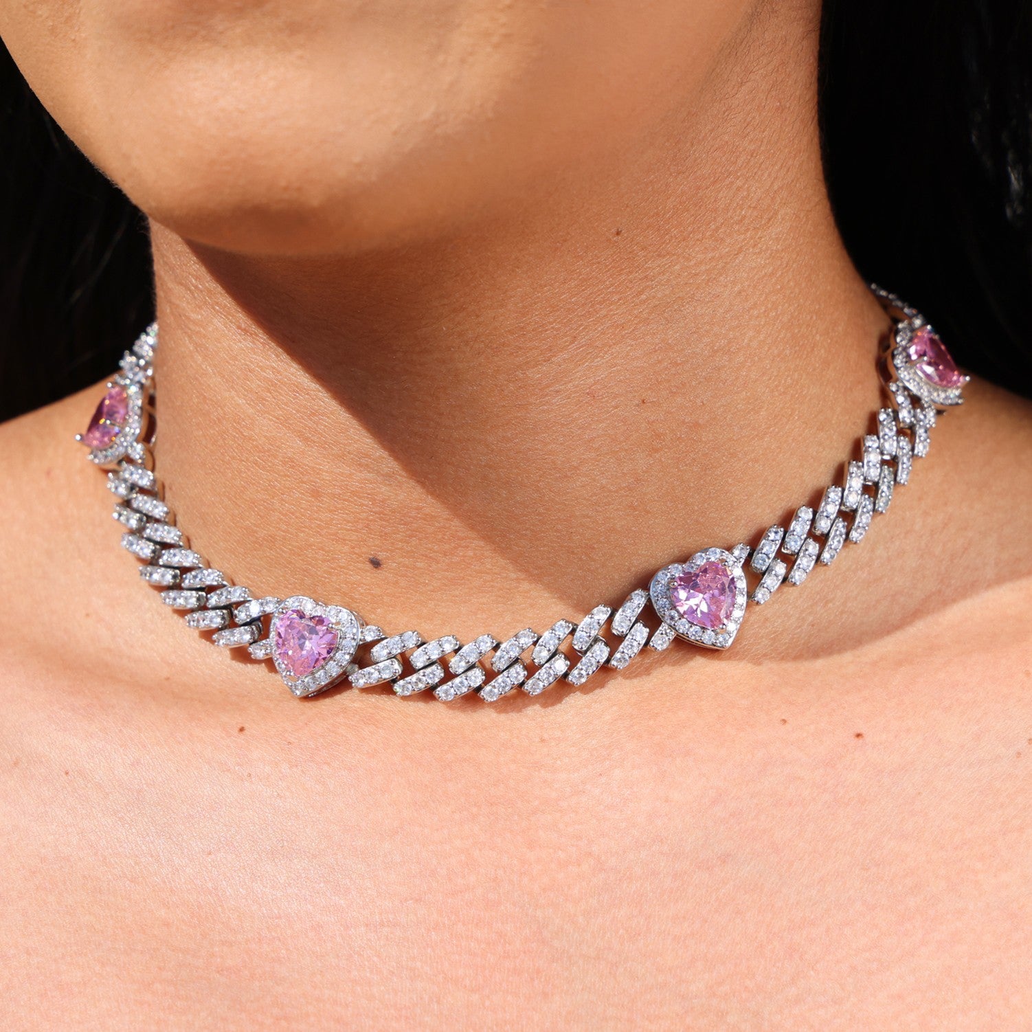 Iced Heart Pink Diamond Cuban Choker Necklace - White Gold